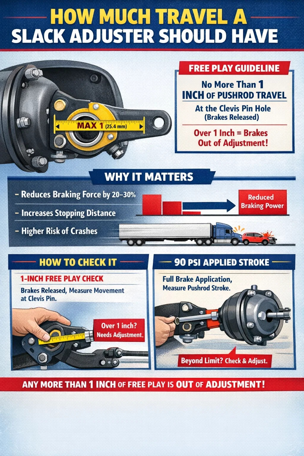 Má sháraíonn an stróc pushrod an teorainn dhlíthiúil le linn feidhmithe coscáin, meastar go bhfuil an fheithicil as feidhm. Braitheann an teorainn chruinn ar chineál agus ar mhéid an tseomra coscáin, ach Is é 1 orlach de spraoi saor in aisce ag an bioráin clevis an tomhas réimse a nglactar leis go forleathan a léiríonn coigeartú cuí. Teastaíonn aird láithreach ar aon choigeartóir bhog a thaispeánann níos mó ná 1 orlach taistil ag an bpointe sin.