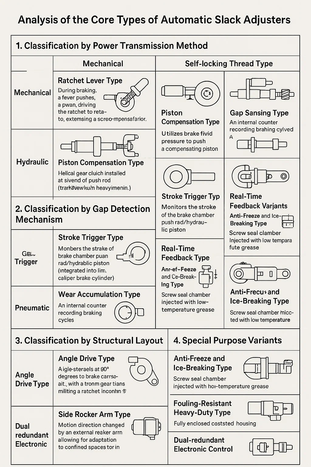 Cineál luamháin ratchet: Le linn coscánaithe, spreagann luamhán pawl, ag tiomáint an ratchet chun rothlú a dhéanamh ar aontreoch, ag leathnú scriú chun cúiteamh a thabhairt do imréiteach (dearadh príomhshrutha do trucailí).