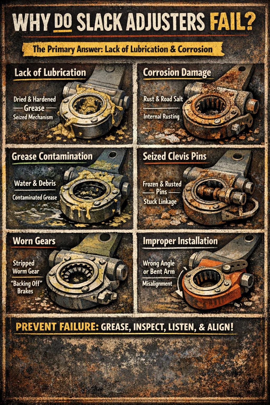 I bhformhór mór na gcásanna, theipeann ar choigeartóirí slack mar gheall ar easpa lubrication gnáthamh agus creimeadh comhshaoil. Toisc go bhfuil na comhpháirteanna seo suite ar an taobh íochtair den chassis, bíonn siad i gcónaí faoi bhagairt ag smionagar bóthair, uisce, agus ceimiceáin dí-oighrithe loiscneach. Nuair a thriomaíonn an ramhar inmheánach nó nuair a bhíonn sé éillithe, déanann an mheicníocht ratcheting inmheánach íogair a urghabháil nó a chaitheamh síos, rud a chuireann cosc ar an gcomhpháirt imréiteach an bhróg coscáin a choigeartú go huathoibríoch. I measc na gcúiseanna tánaisteacha tá caitheamh meicniúil inmheánach na ngiaranna agus suiteáil míchuí an lámh rialaithe.